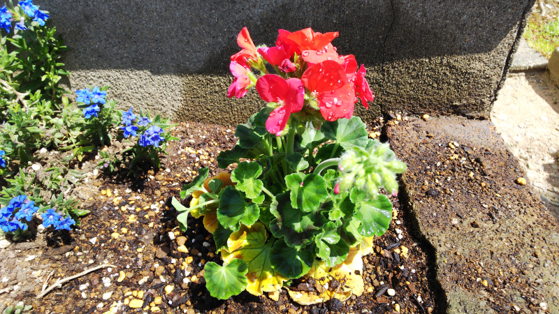 昨日植えた花は、かすみ草を小さくしたような黄色いデージーと、赤いゼラニウム。 ゼラニウムは、小学生の頃に学校の教材として植えた気がする。 子供でも世話できるくらい丈夫な植物で、節くれだっていてあまり色気がないなあと、食指が沸かなかった。 昨年はこの時期は、思い立ってカーネーションを植えてみたのだが、どんどん元気が無くなっていって、しまいには枯れた。 480円もしたのに。 という訳で、今年は丈夫なゼラニウムに妥協。枯れて行くのを見るのはしのびない。 こちらの園芸の腕が未熟なので、植えやすいものしか作れない。 それでも、2苗も植えると、なんだか気分はなごんだ。 昨年の土は、花壇の下の土の部分に落とし、新たに花と野菜の土を花壇に入れ、苦土石灰をパラパラまぜてやる。 花壇の下には、既に我が家の別の場所に生えてきているムラサキツユクサの子株や、マロウの子株を移植。 最後に全部に水をかける。 旦那は旦那で、「プランターでの循環野菜栽培」といった名前の本を昨日めくっていた。 今日は、ブロックを移動させて、部屋からすぐ庭先に出られるようにしていた。 何を植えるのかと聞いたら、植えるかどうかも分からないが、菜っ葉など食べられるものがいいとは言っていた。