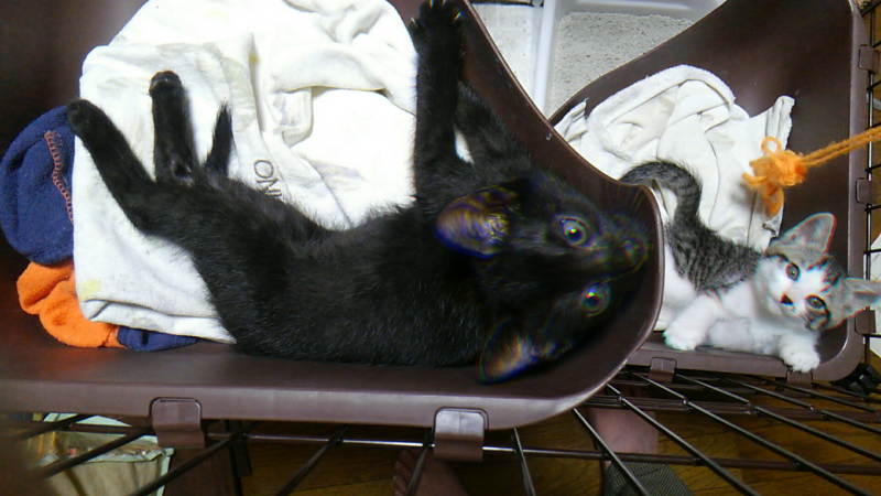 横からだと 黒にゃバジルが見づらいので ケージでまったりを 上から撮ってみた