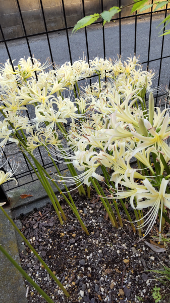 白い曼珠沙華、綺麗ですね。近所にあるところ、まだ花軸を伸ばしたあたりで間がある感じでした。金木犀が香ってきましたね✨