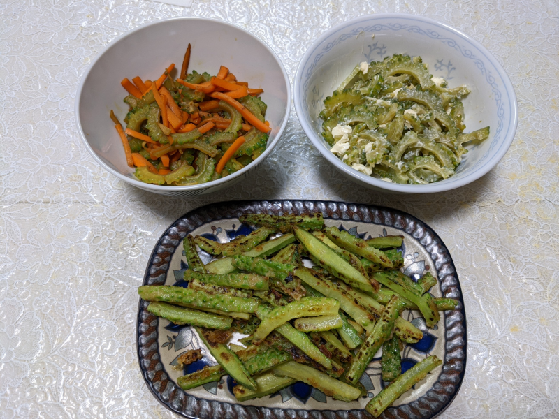 人参と一緒に炒めてゴーヤのきんぴら風。 チンして冷ましたゴーヤとキリのクリームチーズとポン酢で和えてゴーヤサラダ。 唐揚げ粉まぶしてゴーヤの唐揚げ。