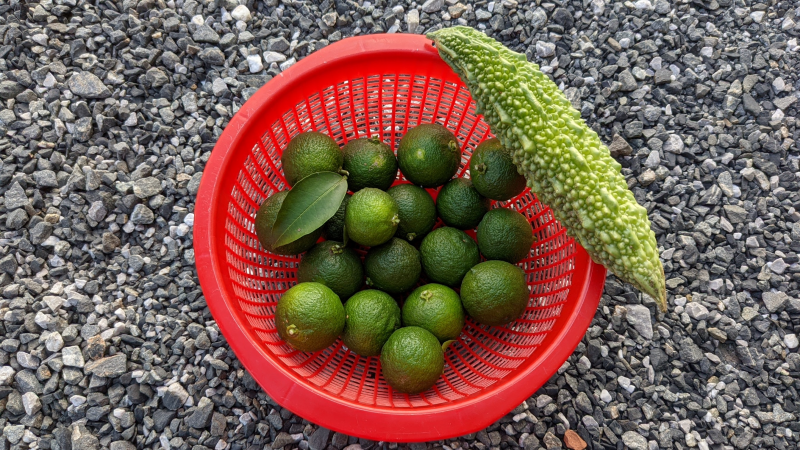 それと、庭の柚子の木、たくさん実ができていて、まだ青いけど間引きも兼ねて収穫。