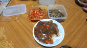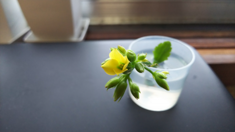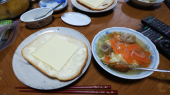 写真1 短日処理中にもげてしまった茎を、計量カップに液肥を入れて置いておいたもの。他の苗と同様に短日処理をしていたら、なんと花が咲いた。 写真2 朝食。日曜日はホームベーカリーのパン、スライスチーズ、具だくさんのスープ。スライスチーズの周りに発酵バターを塗る。 写真3 夕食、ビーフシチューをごはんにかける。キムチとごぼう・しいたけの煮物