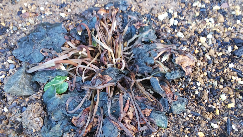 白いほうは、緑の葉1枚と、白いつぼみ数個が生き残っていた。