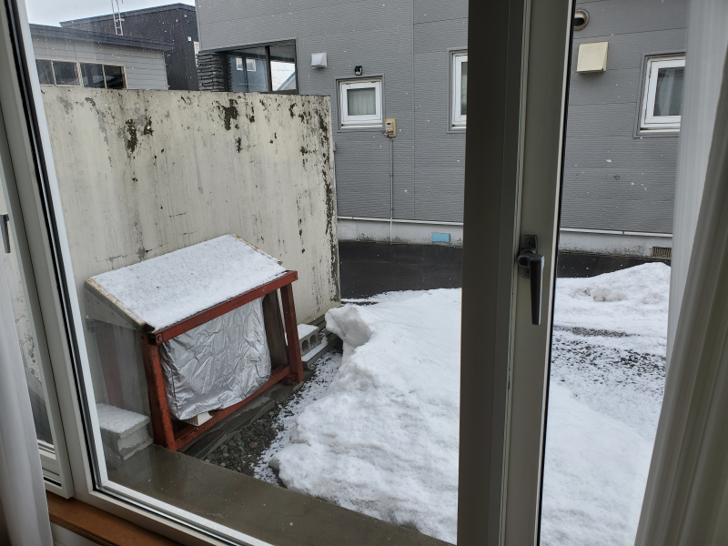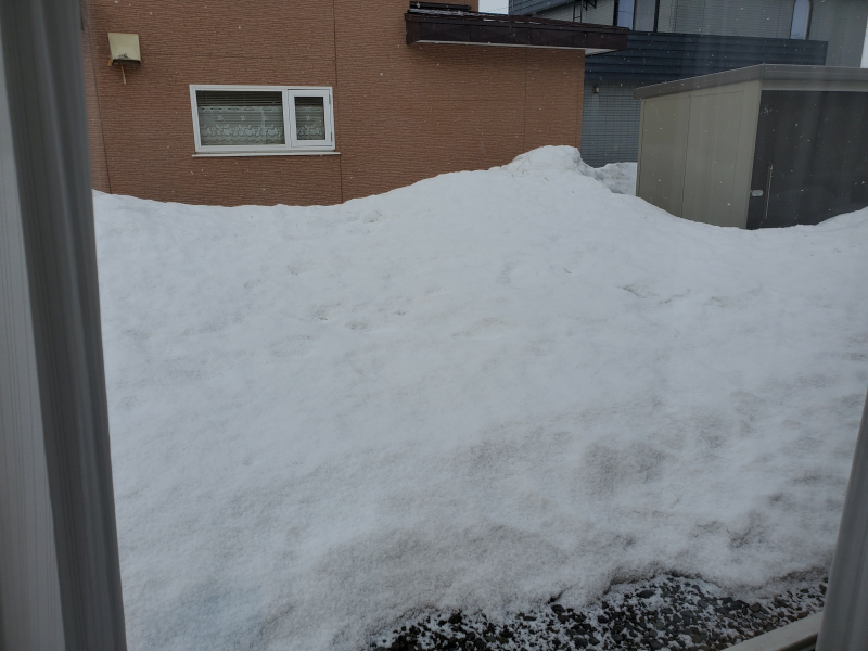 庭の雪はずいぶん溶けて、エアコンの室外機も見えるようになりました ここ、車庫まですっぽり埋まってたからなー 裏の方もやっと物置が半分くらい見えてきましたね