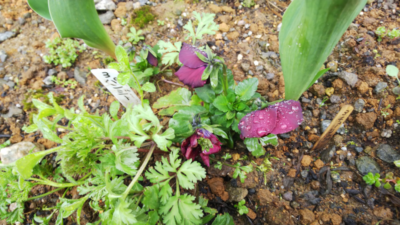 写真1 朝食 写真2 パンジーの花。この間までは1つしか咲いてないと思っていたが、今日見たら3つ咲いていた。他の花の葉(多分アネモネ)に隠れていた。 写真3 夕食