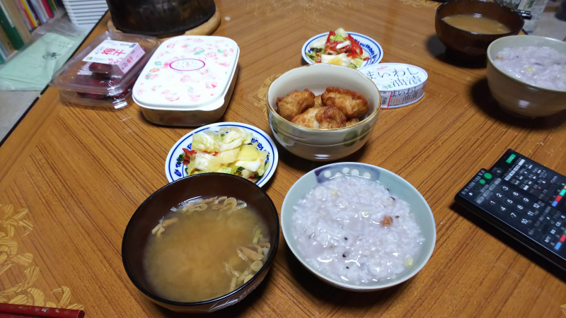 「あー、疲れたー。横になる―」と私が言ったら 「俺も疲れたー」と旦那は茶の間に横になった。 しばらくして旦那から、「今日は午後6時40分にご飯が炊ける。そしたらちゃっちゃと食べて、早く休もう」と提案された。 旦那も最近、高齢の父母の家に時々行って、不要なものの整理をしたりと、忙しくしているらしい。 私の勤務地も片道7km位になり、通勤の送迎時間も増えている。 疲れがたまったのだろう。 という訳で、夕食は昨日のおかずと作り置きのマリネにサンマの缶詰と、インスタントの味噌汁。 これで十分。ありがとう。 という訳で、食事して、「正直不動産」第2話と、「キングダム」1話の録画を見て、それぞれ寝た。