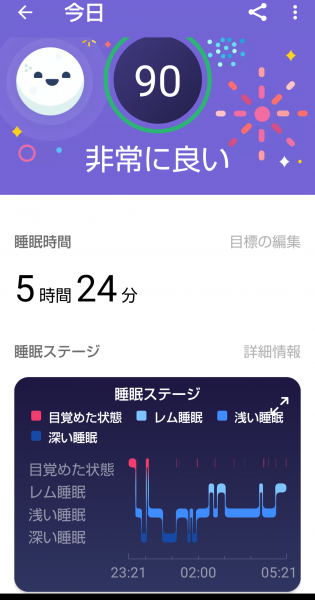 Fitbit測定開始以来、2回目の高得点。 時間的には短いけれど、スッキリはしています♪ (〃´▽`)