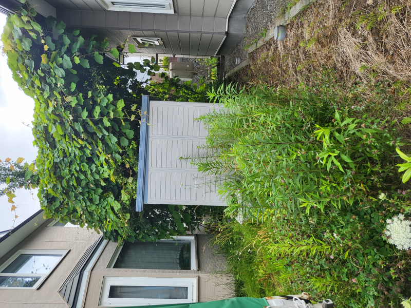 旦那さんです。 今日、この物置の蔦?を切る仕事でした 隣の家の屋根まで伸びちゃってる…