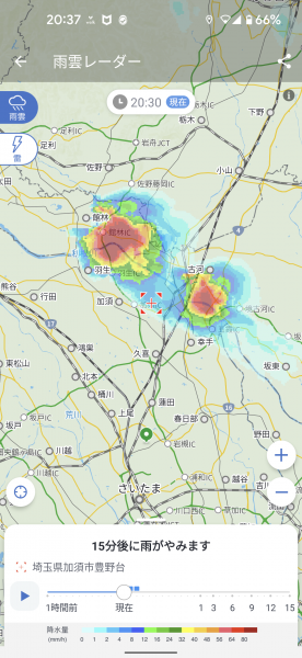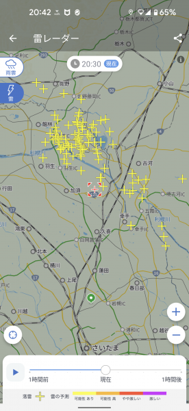 今、20:30過ぎ、外に出たら、東の方角が遠くでビカビカ光ってる。 ヤホォ天気で見たら、茨城と群馬と埼玉の3県のちょうど境目ぐらいが豪雨中。 昨夜はこんなのがうちのところに来てたのね。 お陰でナイトスクープ(テレビ埼玉)が途中、録画が切れちゃったよ(泣)