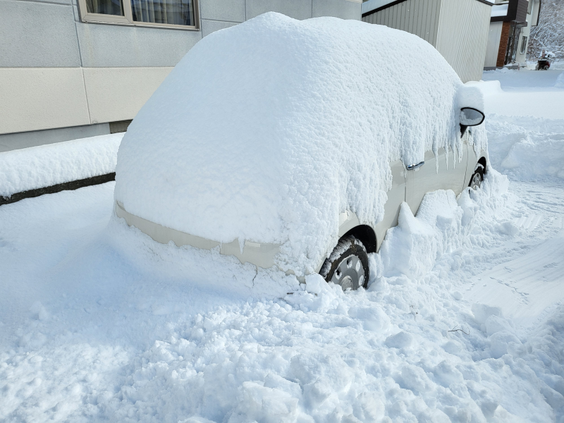 降るときはいっきに来るので 車がかまくらみたいになることもありますよ ただ、まだ気温が高いので溶けます