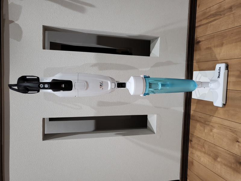 だいぶ前だけど掃除機が届いてました dysonが全く動かなくなり マキタに変えました 見た目はちょっとオモチャみたい(笑)なんだけど 余計な機能がついてないから逆に軽くて使いやすい! フローリングしかない我が家にはピッタリかと思います 吸引力も申し分ない! 水色のサイクロン部分はオプションでつけてますが これをつけなくても紙パックが装着されてるので使えます ここを外すと余計に軽いですよ 自立しないけど、別売りの掃除機立てを購入したので 壁に穴あける事なく置いておけますね 充電はバッテリーなので外して充電器にセットしなくてはならないのが 今までとは違いちょっと手間ですが… それほど頻繁に使わないし、充電忘れてたとしても20分くらいで 充電できるので安心です
