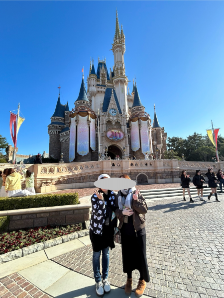 夢のディズニーランド! いいねー!!! アタシも行きた〜い、ウン十年ぶりに。 服が猫柄。 って、ソコかよ(笑) それと、後ろの三人娘の一番左の人の手が幸せそう(爆) さすが、みんなを幸せにするディズニー❤