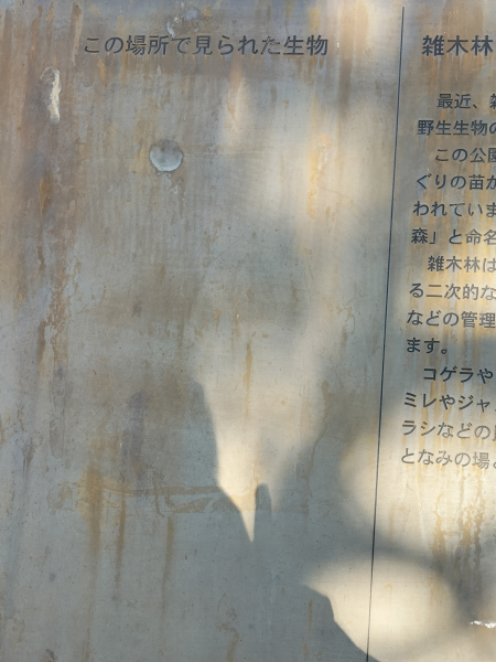 今回は大きめな自然公園へ。 癒やされるな〜。 たまに狸が出るらしいが今回はいなかった(笑) 写真2は、消えていて何の生き物がいるのかわからなかった。 このような看板はいくつかあったが全て消えていた。 消えているというより、絵でも貼ってあったのかしら??