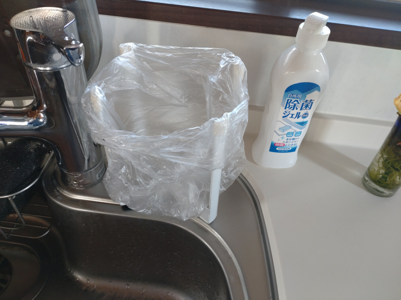 写真は5時半ごろですが、夕方雨が降るような傘雲だ、傘は忘れないようにしないと。外に置いてあるゴミ箱には70㍑の袋、ほぼ犬のおしっこと雑草が入っているが、大変重たかった。あまりため込むのは良くない、もう一つは生活ごみは45㍑袋に入れてあるが、4分の1ほどしか入ってないが、閉めっぱなしの部屋になるから捨てました。 流しの排水口のごみ取りは、スーパーに巻いてある濡れ漏れ防止の薄っぺらな袋に漂白剤を入れて、ゴミ止め防止ネットを漂白剤に着けます。 この薄いスーパーの巻きビニールは、コップ縦につけて(写真)、ごみ取りに使っています。結構便利に使っていますよ。
