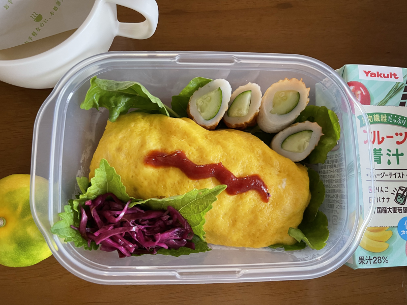 オムライス弁当。 ケチャップでハートを描く気にならず。 今見たら、ギザギサの口に見える。 投影ってヤツだな(苦笑)