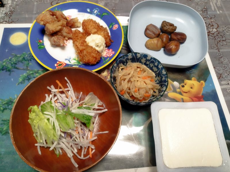 唐揚げ カキフライ 甘栗 大根サラダ 切干 冷奴 <( ̄︶ ̄)>