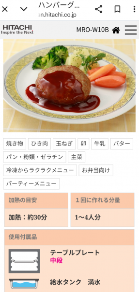 旦那さんが‘ハンバーグを食べたい♪’と言うので、水蒸気を使ってオーブンレンジで初挑戦。 フライパンだと、ちゃんと中まで火が入っているか気を遣う。