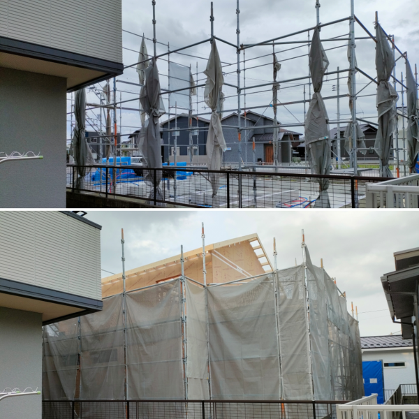 昨日はお隣の棟上げ工事。 午前中に半時間ほど土砂降りで一旦中止していたが、その後は曇り空でまぁ予定通りに進んだのではなかろうか? 我が家を建ててから31年になるが、東側はずっと田んぼで台風などの強風に被害を被ったこともある。 東向きなので朝日が強烈で、カミさんが嫌がりキッチンの窓は常時ブラインド状態だった。 田んぼは数年前に住宅地に区画造成され、ぼつぼつと売れてようやく東西両隣に挟まれる形になったという訳だ。