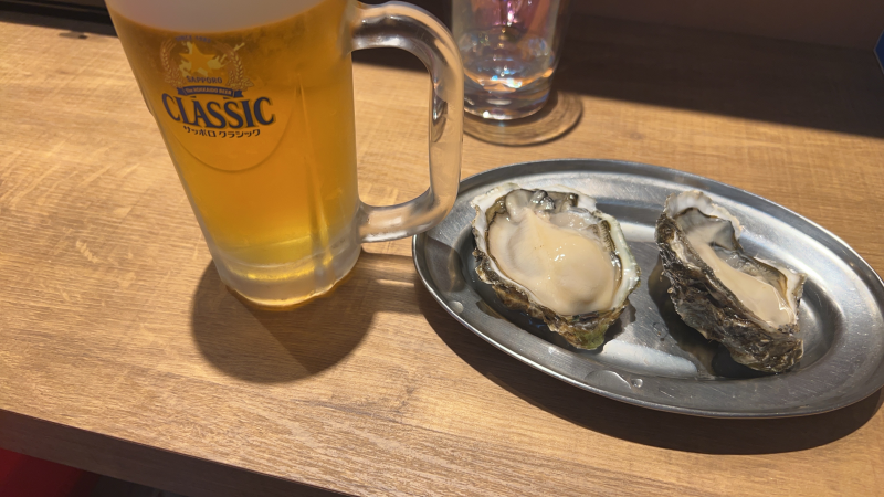 こちらのお店は北広島駅直結で今年春にオープンした「トナリエ」という施設にあるんだけど、厚岸の牡蠣(生or焼き選べる)2個にビール一杯がセットで1600円と安い!とは言えないが、牡蠣のクォリティは高かったです♪