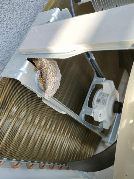 殺虫スプレーを持って直ぐに行動に移した。 裏庭に出て普段使っていない和室エアコンの室外機のファンに向かってシューとやったら、なんと蜂が数匹飛び出してきた。 暫く殺虫スプレーで撃退したが、それでも戻ってくる蜂も居て、やはり巣を撤去して原因を取り除かねばと、室外機のカバーを外したら・・・(*´Д`*) 直径15㎝くらいの巣が有り、直ぐに撤去したら巣の中には蜂の子が幾つか居た。