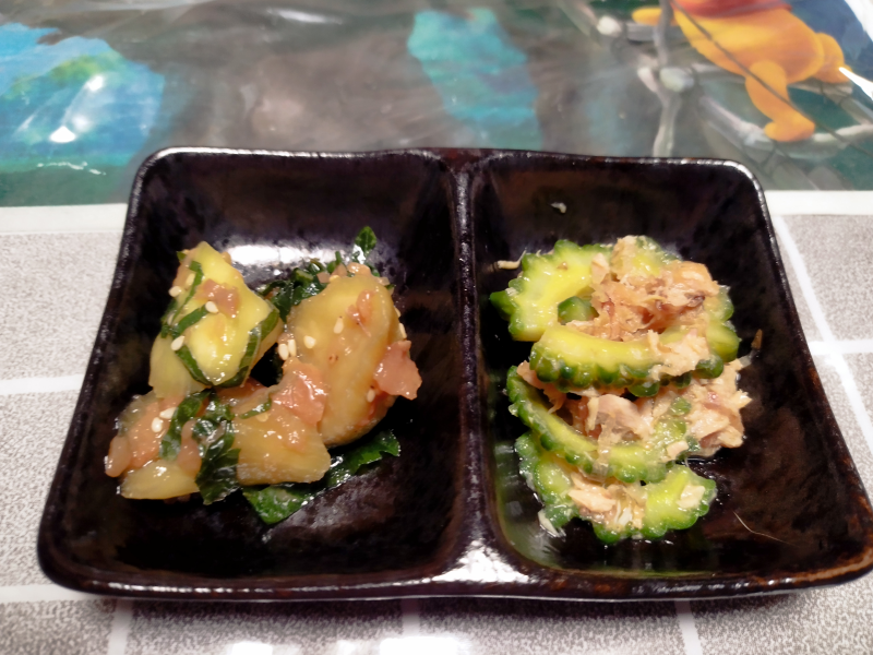 ナス梅肉和え ゴーヤツナ和え 前日残りのピザ <( ̄︶ ̄)>