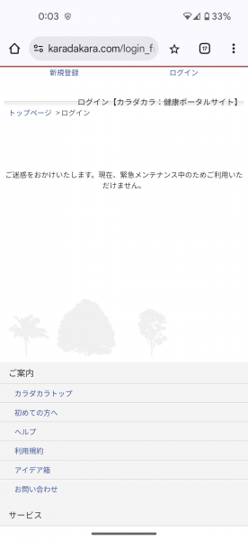 一昨日あたり、カラダカラが重くて重くて仕方なかった時、こんな画面に誘導された。画像1 緊急メンテナンス? 凄っ(・o・)