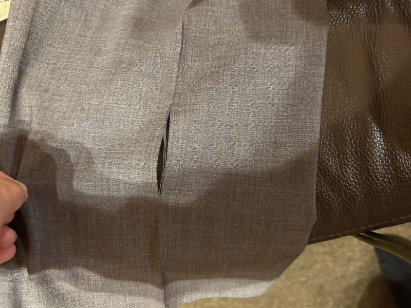 もう一つ文句を言いたことは、スラックスの折り目で破れる、裾がほころびるならまだわかるが、脛の折り目で口が空くなんて、初めての事、クリーニングがきついプレスにしたって、こんなこと今までないよ。 写真撮りましたよ、でも、クリーニングが悪いとは言えないしね、結構気に入っていた色のスラックスでとても残念です