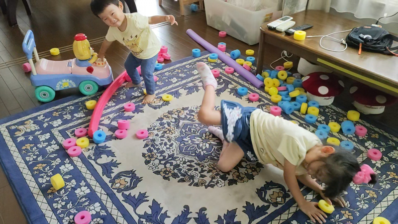 姉弟は早速玩具箱をぶちまけて伸び伸びと!!