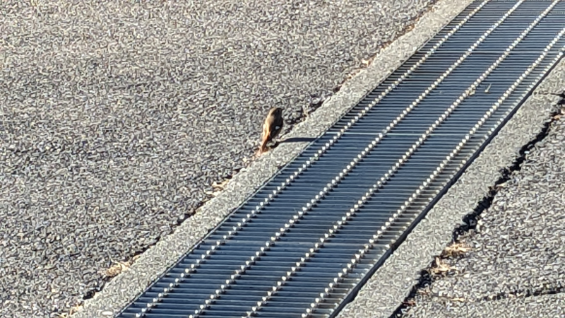 朝、窓の外を見たら、ジョウビタキ(♀)が道路の真ん中にポツンと。