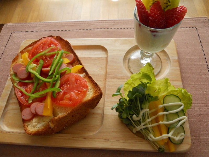 パンの耳の上にチーズ、ピーマン、トマト、ウインナー1本 をのせて、、、、好みなのですが、オリーブオイルを匙1杯 ふりかけると 出来上がりがしっとりしていて 美味しいですよ。 380㎉です。 デザートは120㎉ |
