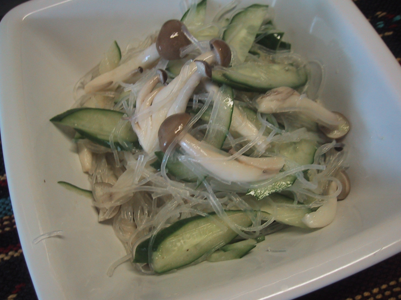春雨、しめじ、きゅうりを加えて器に盛り付ける。