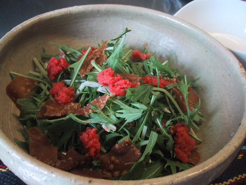 さっぱりとした味の水菜にコクのあるヨーグルトを合わせたリッチでクリーミーなマヨドレッシングが好相性です。ほぐした辛子明太子を全体にちらして、ワンタンの皮を油であげたトッピングでパリパリ感もあって美味しくいただけます。