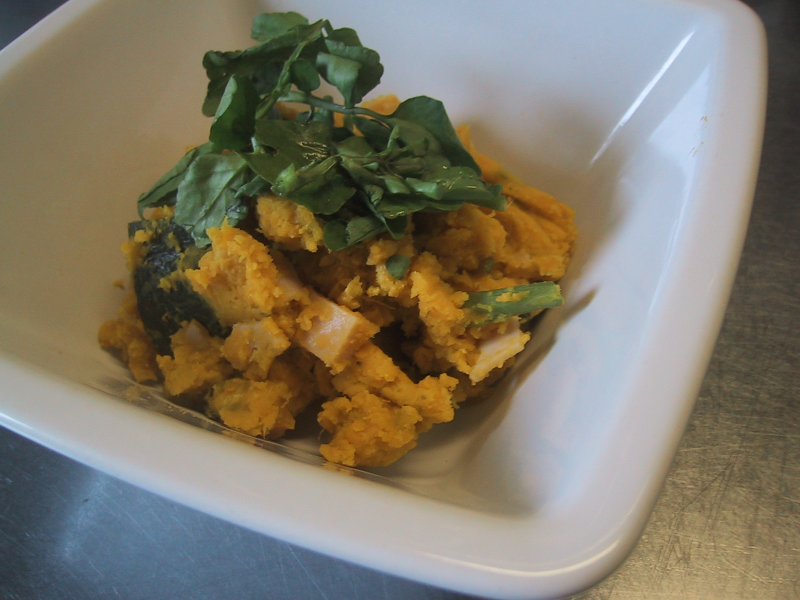 かぼちゃはわたと種を取り除き、4㌢角にきって皮をむく。