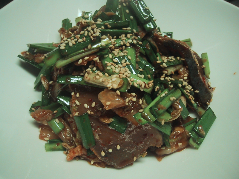 白菜キムチ、ニラ、を加えて全体を混ぜ合わせて器に盛り、白いりごまを散らします。